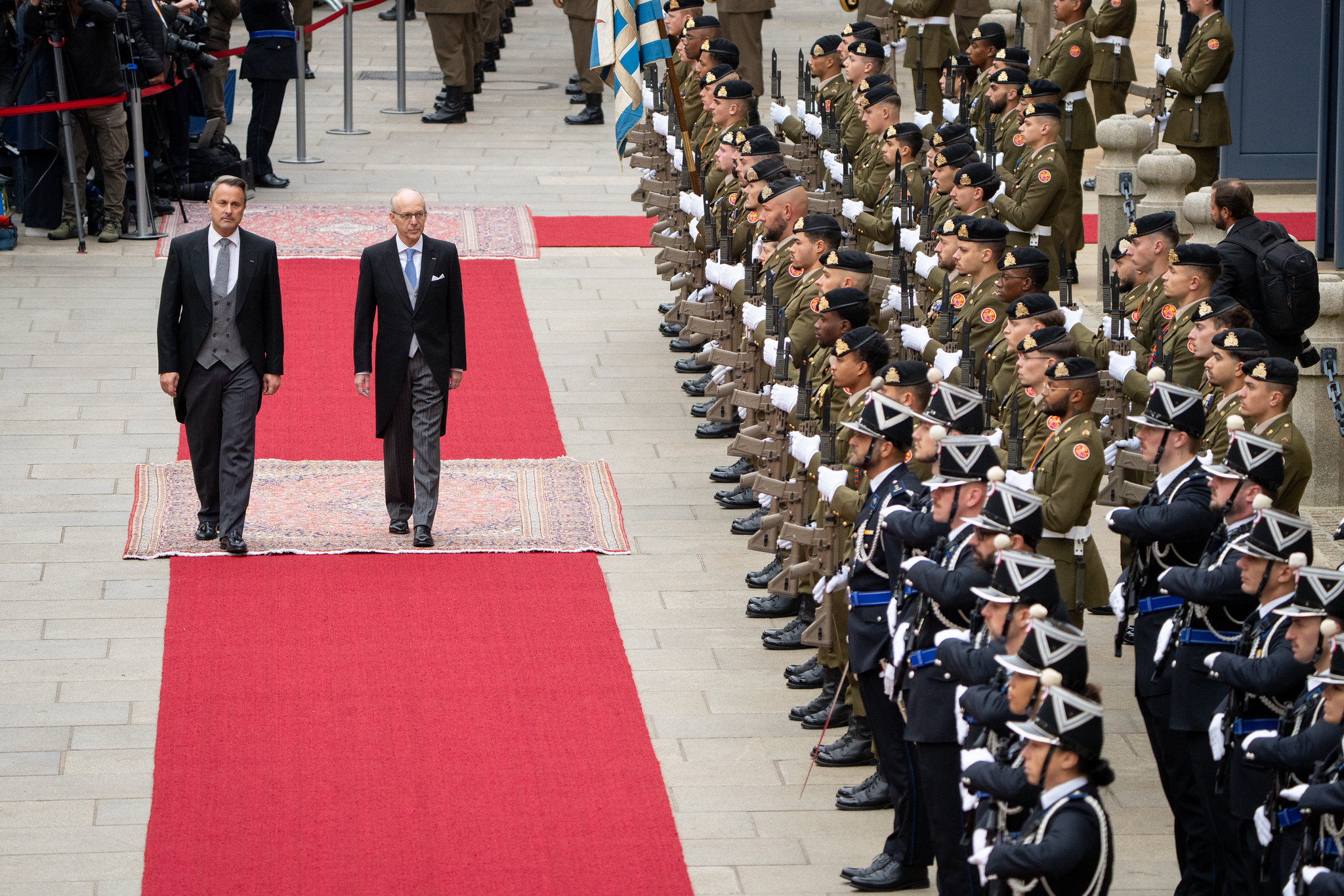 Um Rand vun den offiziellen Zeremonien, empfänkt de Premierminister Luc Frieden de President vun der franséischer Republik, Emmanuel Macron, am Sennenger Schlass vir e Gespréich.